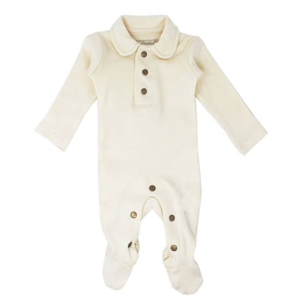 GOTS certified 100% organic cotton 3-snap panel for easy dressing, with additional snaps from ankle to ankle for easy diaper changes polo style collar for formal dressing rubber-dotted grip soles...