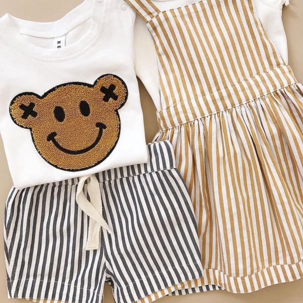 This is a two-piece short set for babies and toddlers up to 4t! These come with a short sleeve top + shorts. The shorts have an elastic waist and faux tie. 95% Cotton 5%...