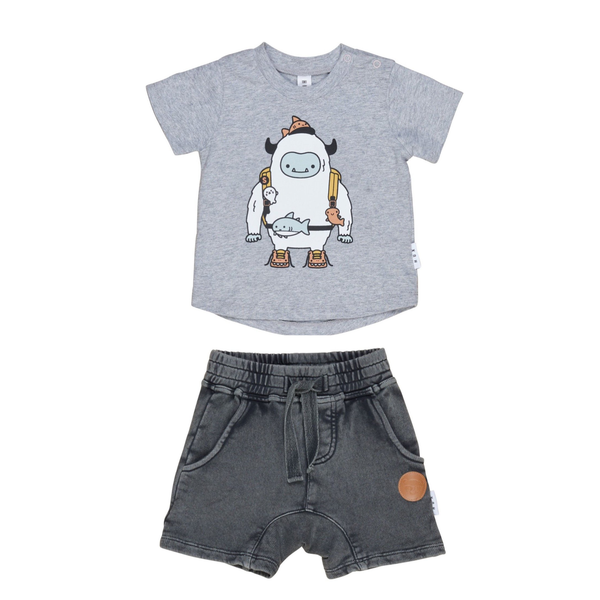 Yeti T-shirt Grey Marle Color Super soft, premium organic cotton jersey t-shirt with yeti print Baby sizes have stainless steel snaps at shoulder opening Charcoal Slouch Short Super soft, premium organic...
