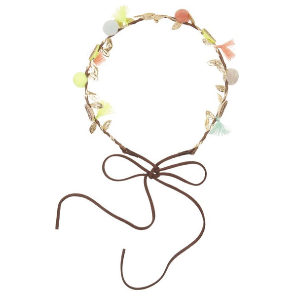 The perfect garland for the beach, festivals, parties and general summer fun! With a wire base and suedette adjustable long ties, this crown is entwined by gold leaves and is embellished...