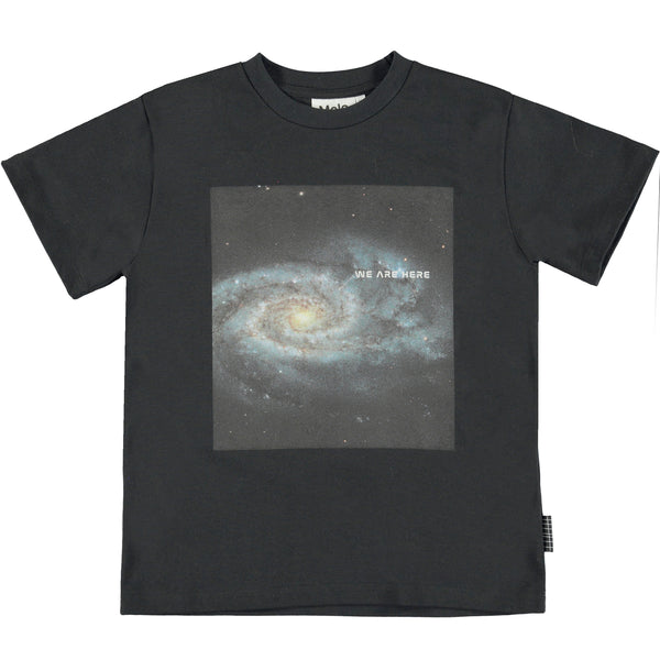 Riley is a black t-shirt with a print of the galaxy and the text 'We are here'. This Molo product is GOTS certified organic, which means that it is made...