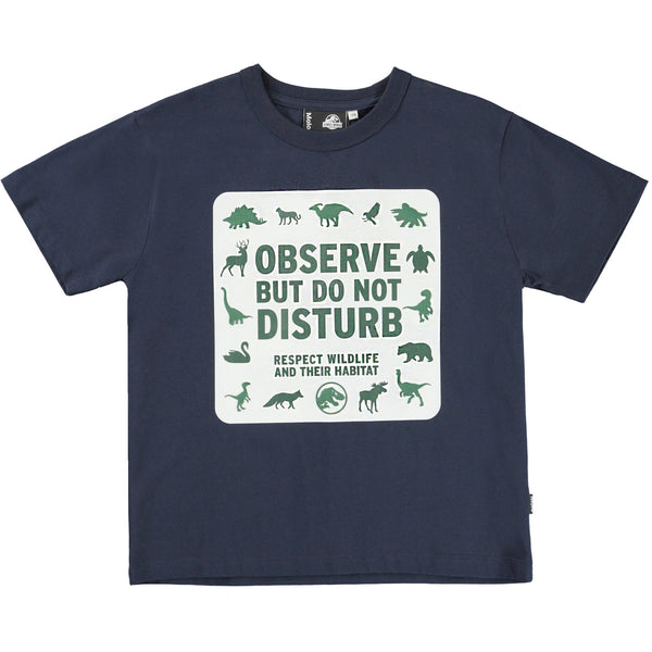 Molo x Jurassic World. Riley is a dark blue t-shirt with a print of a warning sign on the front with a picture of various wild animals, including dinosaurs, with...