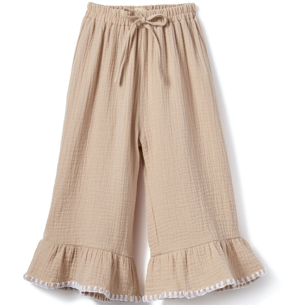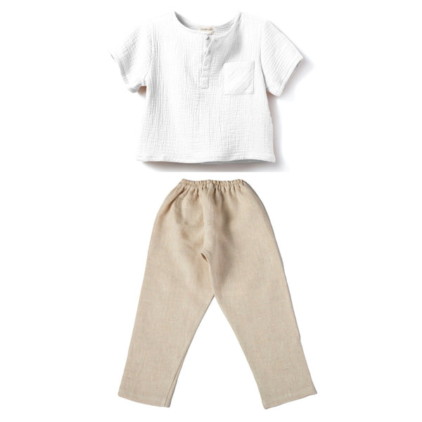 Alloon short-slee-ved dress with embroidered ruffles on collar and sleeves, with natural buttons down and strings closure in front.
