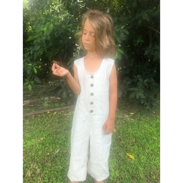 Sleeveless mid-leg jumpsuit with two hidden pockets on sides and five coconut front buttons.