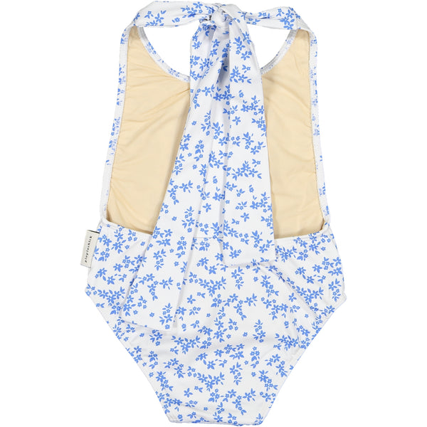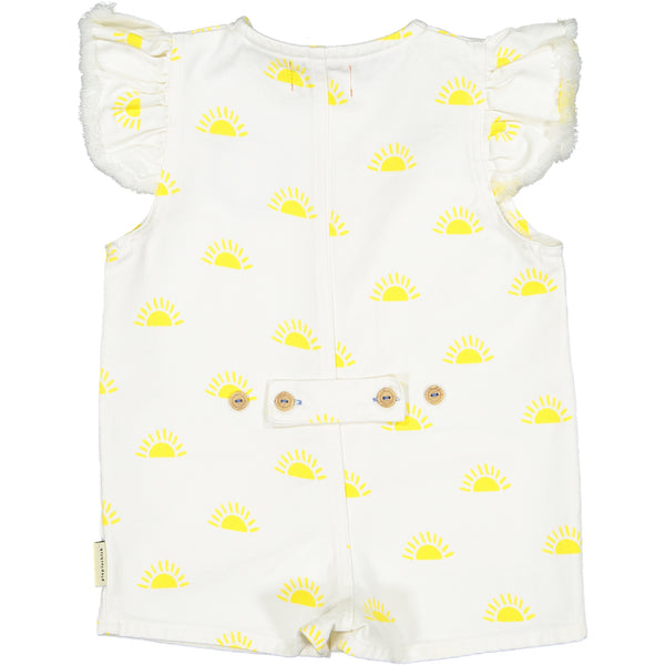 Baby short and sleeveless jumpsuit with easy press buttons between legs. Wood buttons on the front. Orange "beach club" print in the front and orange waves in the back. Navy...