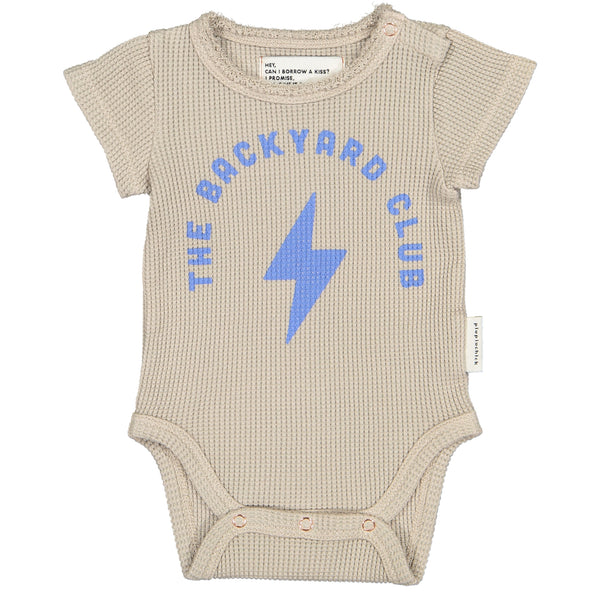 Baby short sleeve body in textured cotton and with easy popper buttons between legs and shoulder.