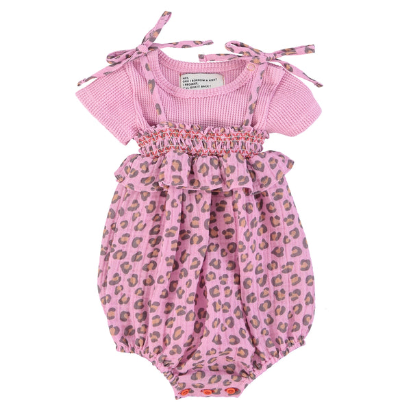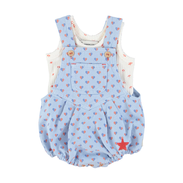 Baby romper with ruffle shoulder straps, wood buttons on the back, buttoned crotch for easy opening and elasticated thighs. Color: Pomegranate color with green hearts print. Made in: Portugal. Made Of:...