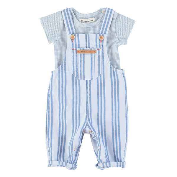 Denim dungarees with adjustable straps. Black "Music" print on the front. Green logo embroidered on the back pocket.