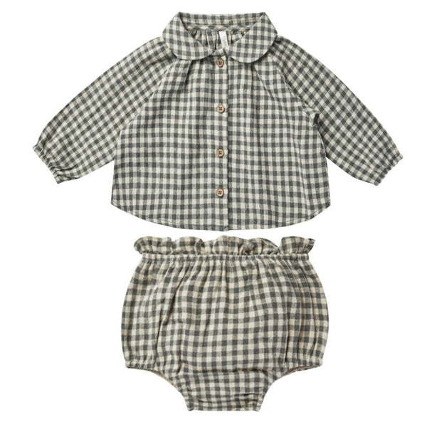 Nellie Top: Fun and flowy shirt with a collar at the neck and button front detail. Pairs great with our Nellie Bloomers. Nellie Ruffle Bloomer: Bloomers featuring an elastic waist...