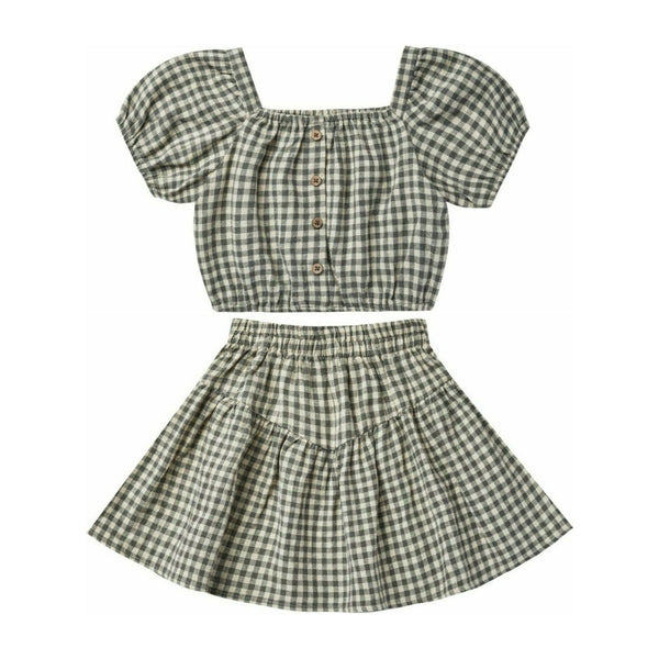 Skipper Top: This square neck cropped woven top is the perfect mix of stylish and playful. Featuring a mock button front and elastic waistline. Sparrow Skirt: A full gathered swing...
