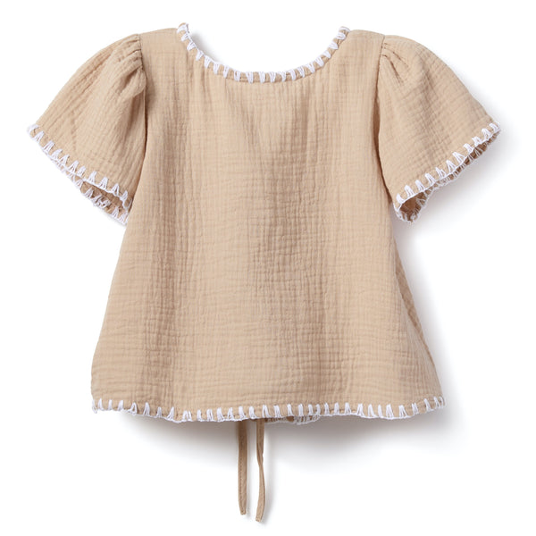 Easy and comfortable semi cropped top made in natural linen with a low-cut back and a couple of wood buttons.