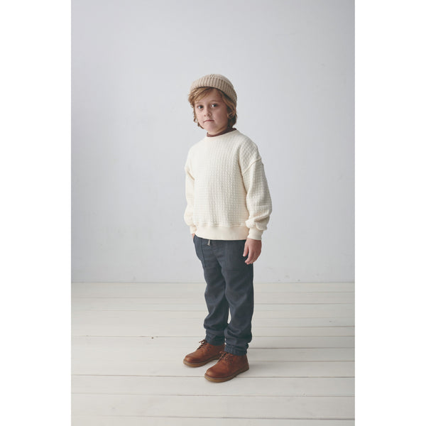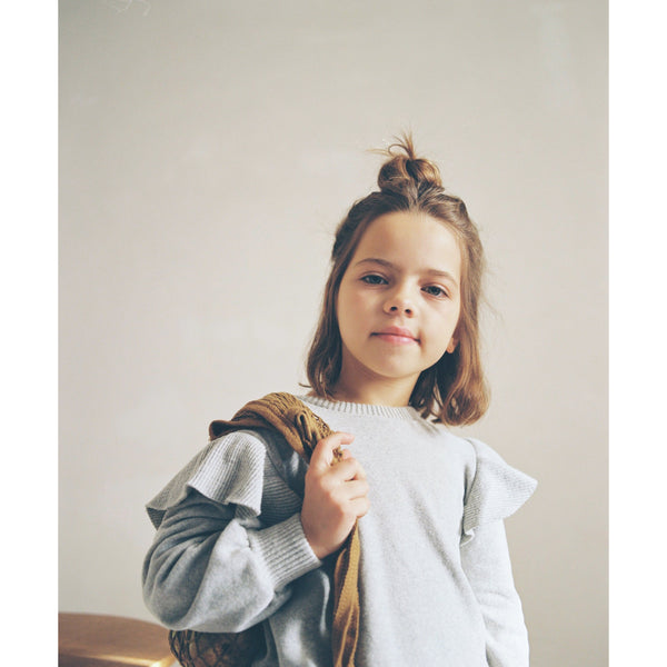 This organic recycled soft knit sweater features a crew neck and ruffled shoulders. Rib at neckline, cuffs, and hem. Made of: 58% Recycled Cotton. 38% Organic Cotton. 4% Elastane. its fibers...