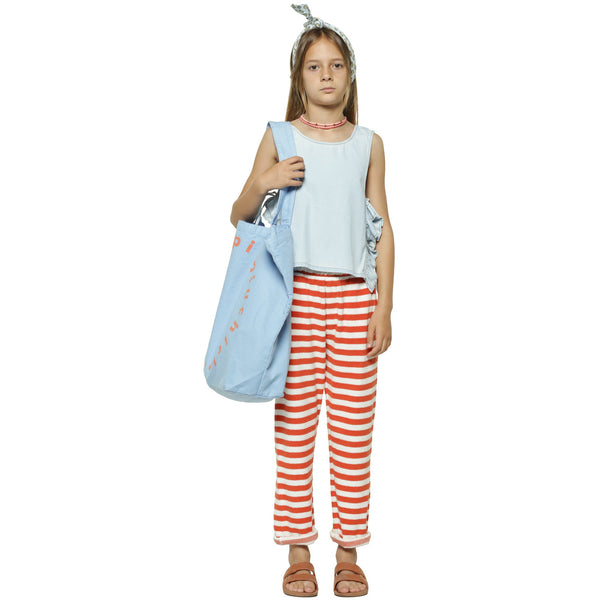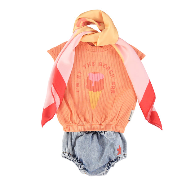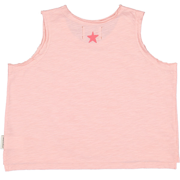 Sleeveless top in organic ribbed jersey with wide armholes and elastic hem for a pleated effect. Detailed with front print and a star print on the back. Coral w/ print...