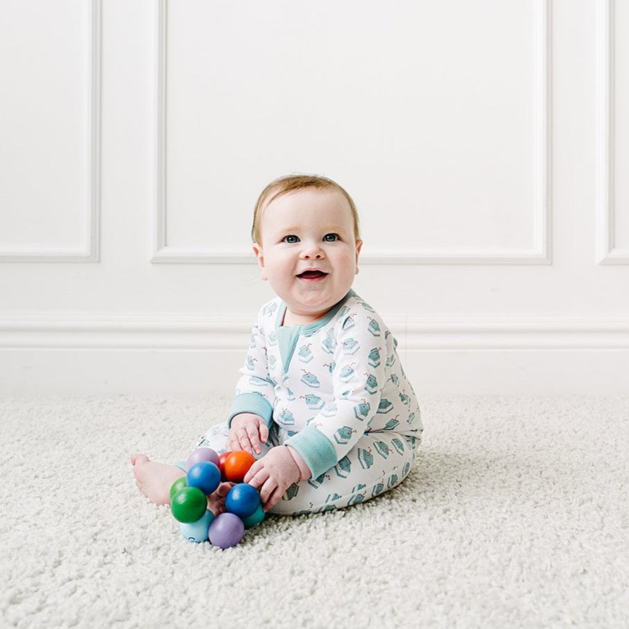 Happy Jammies are made with super soft organic cotton, featuring a 2-way zip for easy changing and fold over foot-cuffs for a convertible bootie.