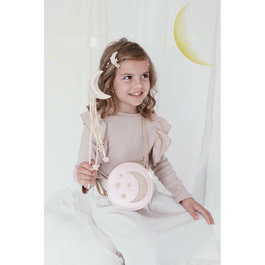 Wave your magic wand and imagine the moon and stars appearing! In gorgeous opal glitter fabric adorned with gold ribbons and dusky peach stars, this is the perfect wand for magical spells, imagination adventures, or a fun addition to the dressing up box!