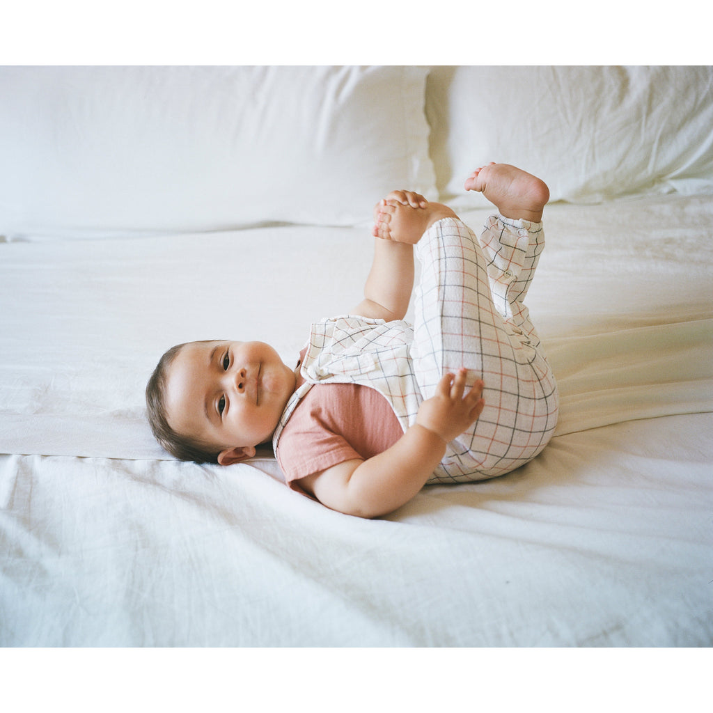 These organic crepe overalls are designed with a straight neckline and adjustable straps at the front in an all-over plaid pattern.
