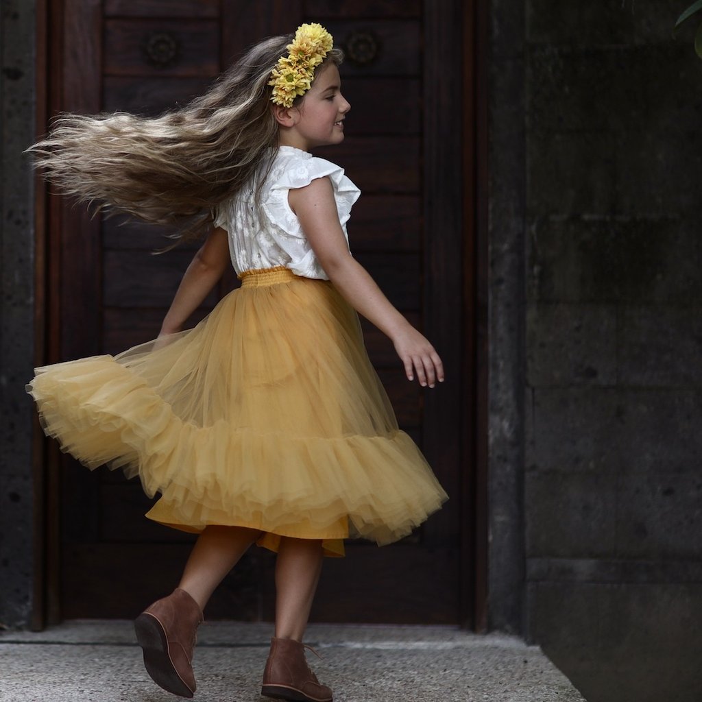 Featuring a soft elasticated waist with room to grow, multiple layers of super soft tulle and oodles of ruffles to twirl the day away it has also been fully lined in matching mustard voile.