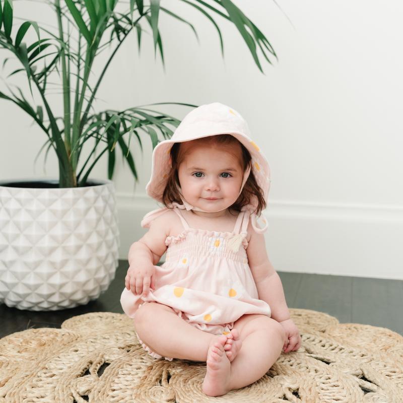 Screen printed daisies on a smocked romper onesie with soft elastic around the legs and shoulder ties with tassels.