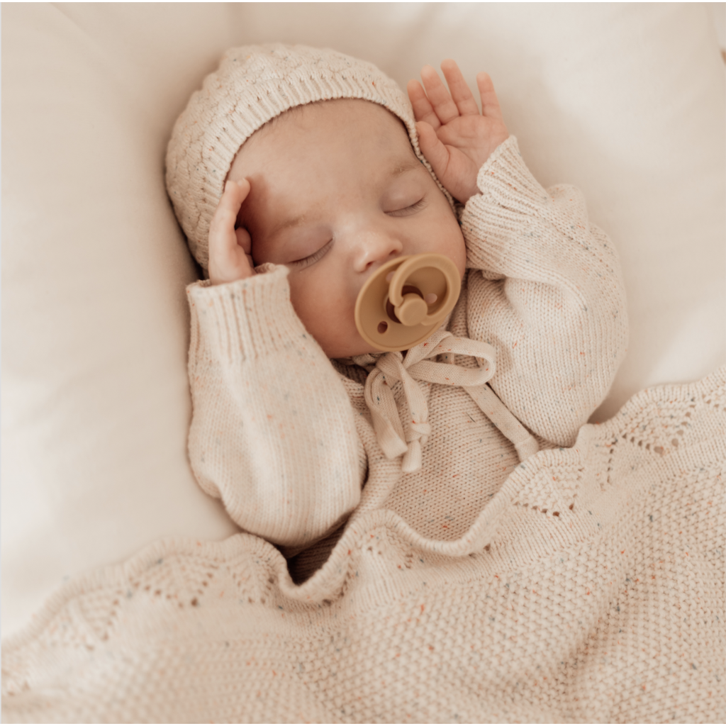 Knitted bonnet with a bubble texture to beautifully complement our delicate knitted romper. Designed to be a timeless keepsake to remember just how teeny, tiny they were. An heirloom piece to pass down to other siblings or a special something to pop in their keepsake box.
