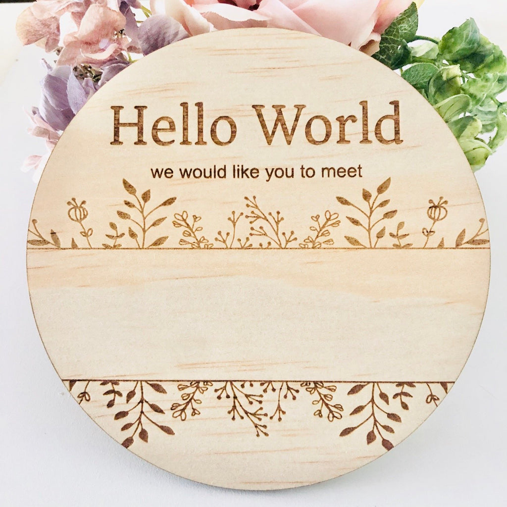 This birth announcement disc is laser carved on a quality 3mm wooden disc with botanical details and room to write bubs name in.