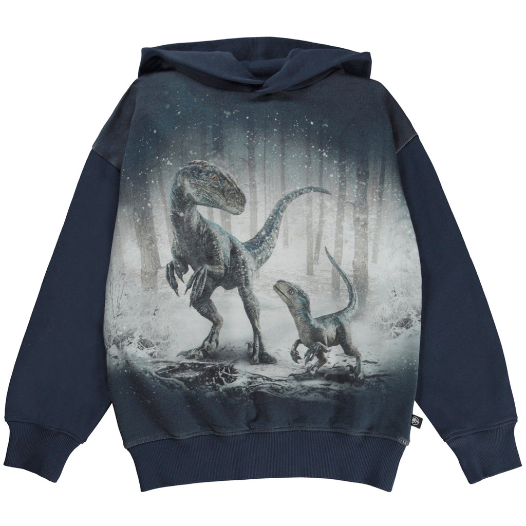 Molo x Jurassic World. Matty is a dark blue sweatshirt with a print of two Velociraptor dinosaurs in a snowy forest.