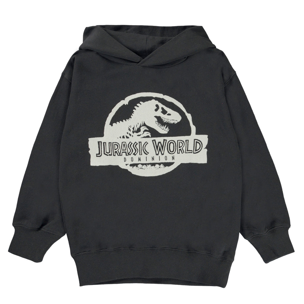 Moz is a black hoodie with a large, embroidered Jurassic logo on the front.