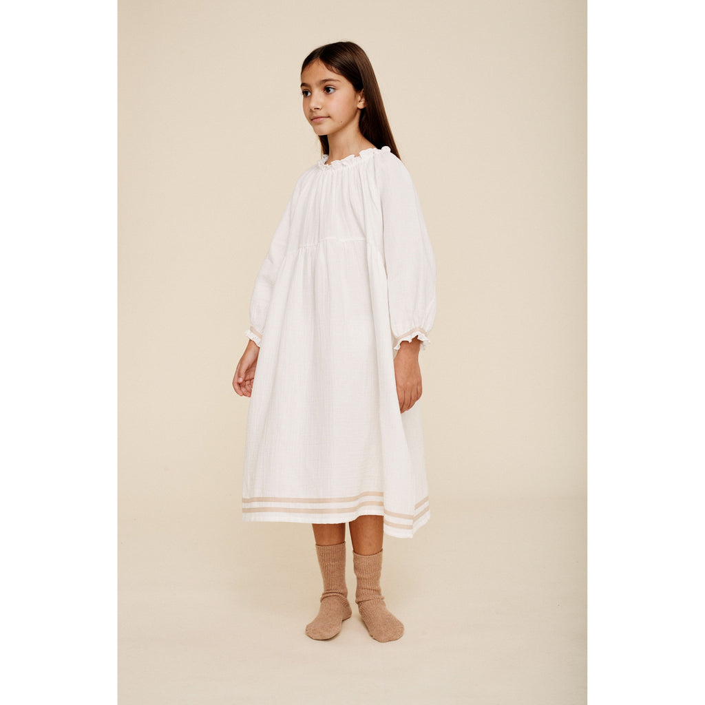 The nightdress is a long nightgown with a wide, loose fit for a comfortable feeling. It has a beautiful gathered elasticated neckline for an easy change. The long-puffed sleeves are ruffled together, an elasticated wristband with a herringbone tape stitched on it for details. It has a nice loose fit. midi-length with stitched herringbone tapes along the brim.
