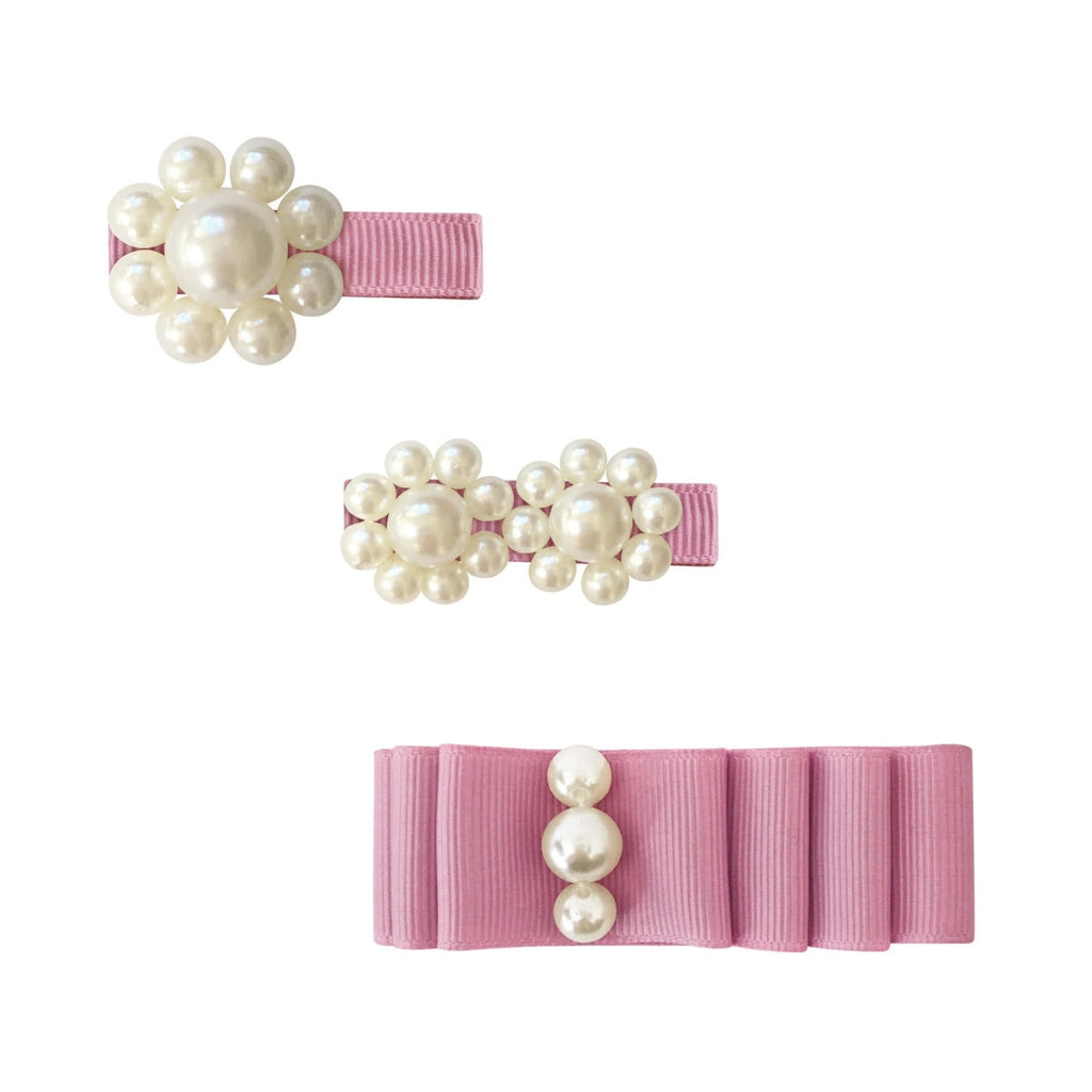 Cute gift set containing 3 different Milledeux® bow clips with grosgrain and pearls.
