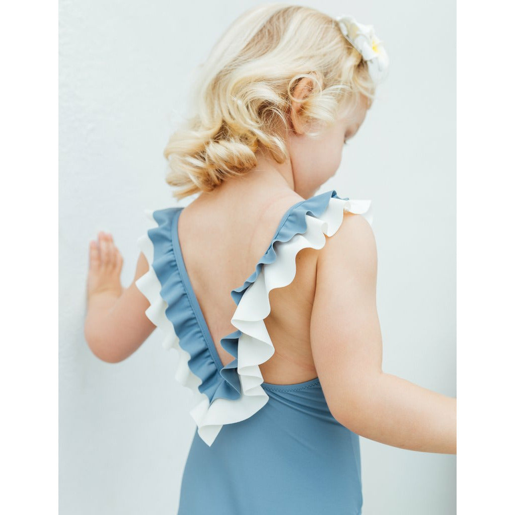 timeless and romantic, our adorable penelope one piece swimsuit in dusty blue and ivory is every little girls' dream.
