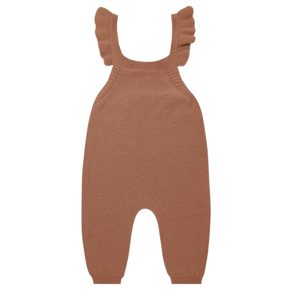 Pointelle knit overalls in the softest sweater knit with adjustable button straps and a ruffle detail at the sleeve.