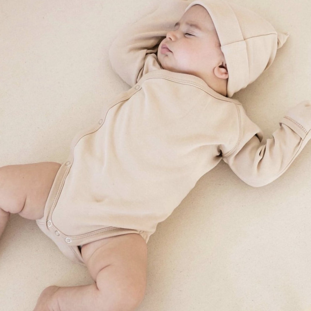 Kimono onesie made out of our lightweight pointelle fabric. Snaps at sides and along inseam for the coziest fit with foldover hand mitts.