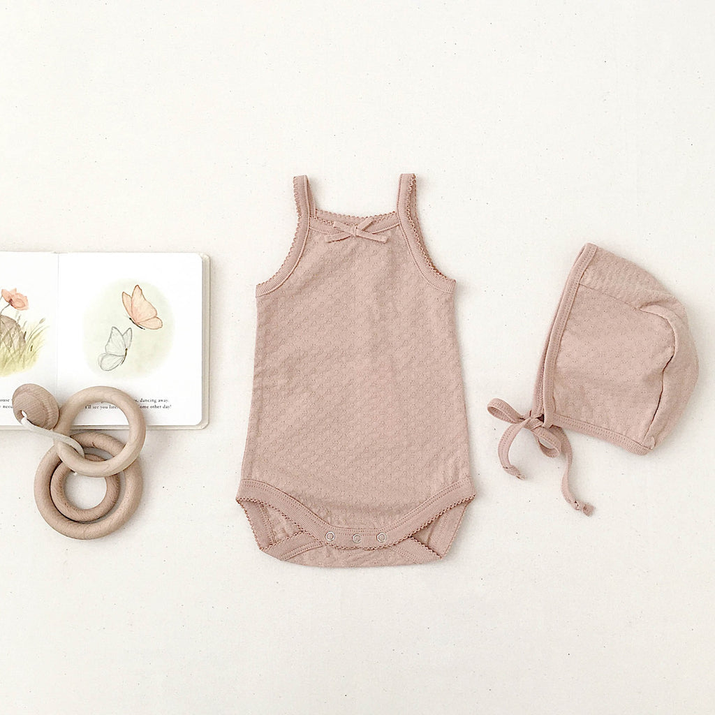 Organic cotton pointelle tank onesie with bow at chest. Snaps along inseam for easy changing.