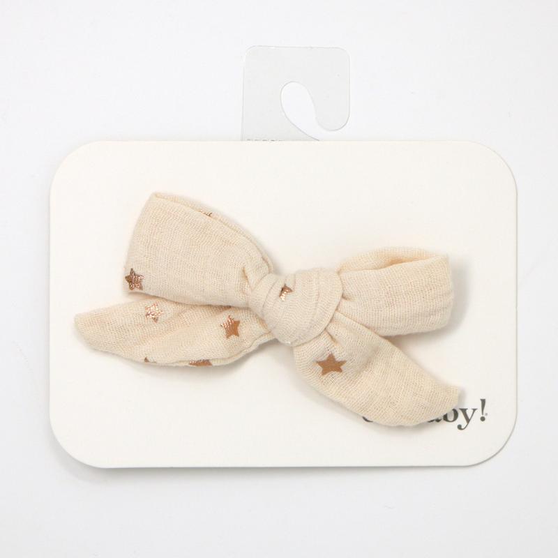 Set of two classic school girl bow barrette in gauze fabric on a non-slip pinch clip. Screen printed rose gold stars. Fits infants, toddlers and girls.