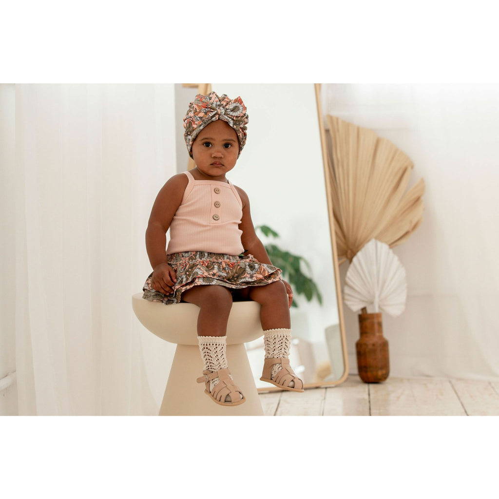 The New shape singlet baby romper is a new design this summer, it is an easy pull on style onesie that has snaps a the crotch for nappy changes. and faux coconut buttons. Perfect for a warm summer's day, it can be worn on is own or with our puff bloomers.