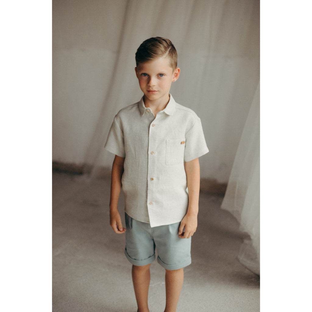 Shorts with zip, darts and turn-up bottom. Adjustable button and button-hole elasticated waist on the inside. Pocket on the back.