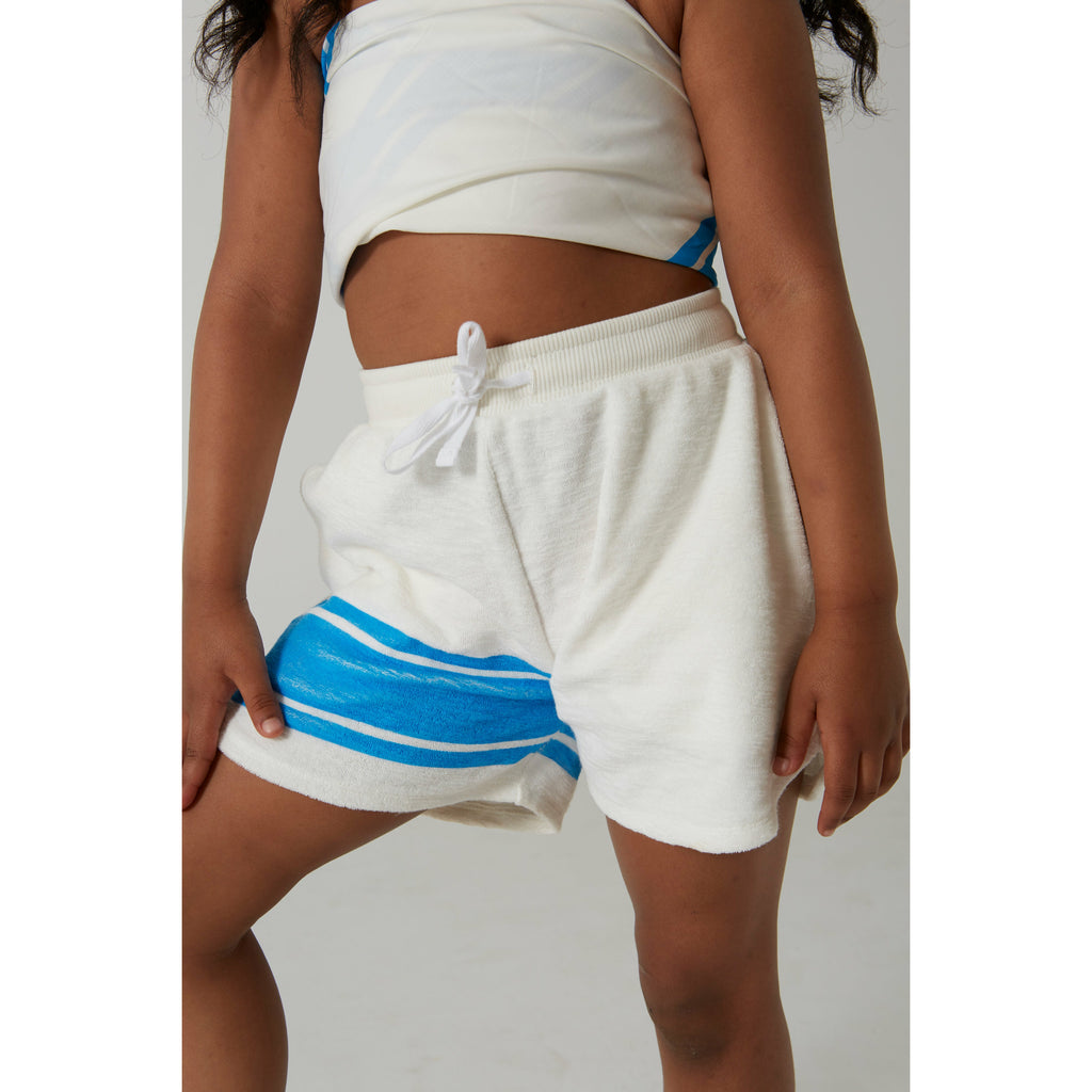 An extremely comfortable tennis training short that comes in lightweight, airy cotton summer towel, elasticated waistband with drawcord, asymmetric blocking and stripes, printed logo at the back.